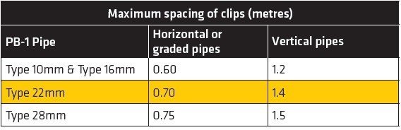 Buteline PB-1 pipe must not be “anchored tightly” between 2 points. Pipe unsupported by clips are unsightly and can be damaged.