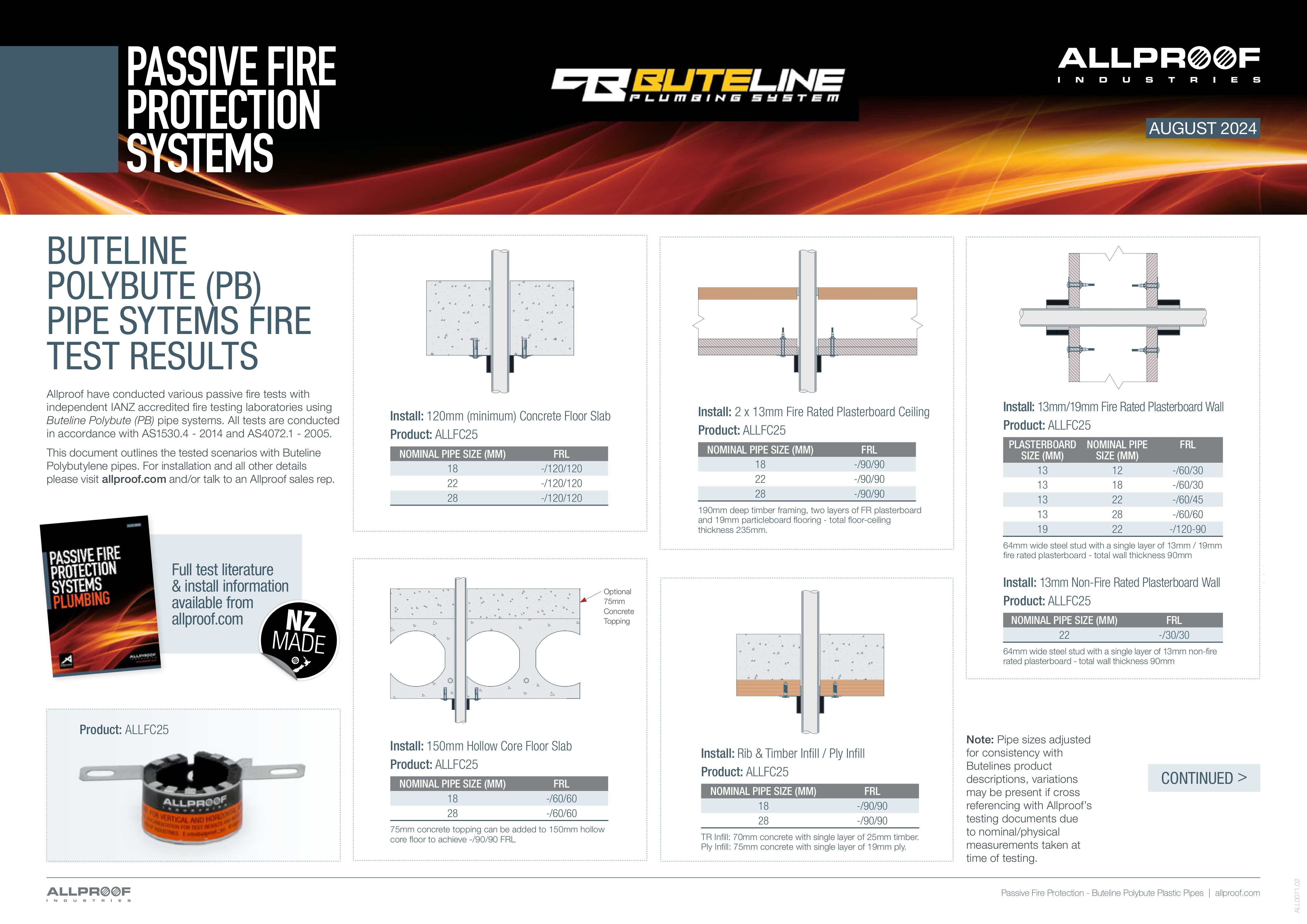 For more information on passive fire protection solutions for plumbing (such as fire collar and sealants), or for expert guidance to achieve the required rating and protection, please contact AllProof (email info@allproof.co.nz, phone 09 481 8020) or refer to their website (www.allproof.co.nz).