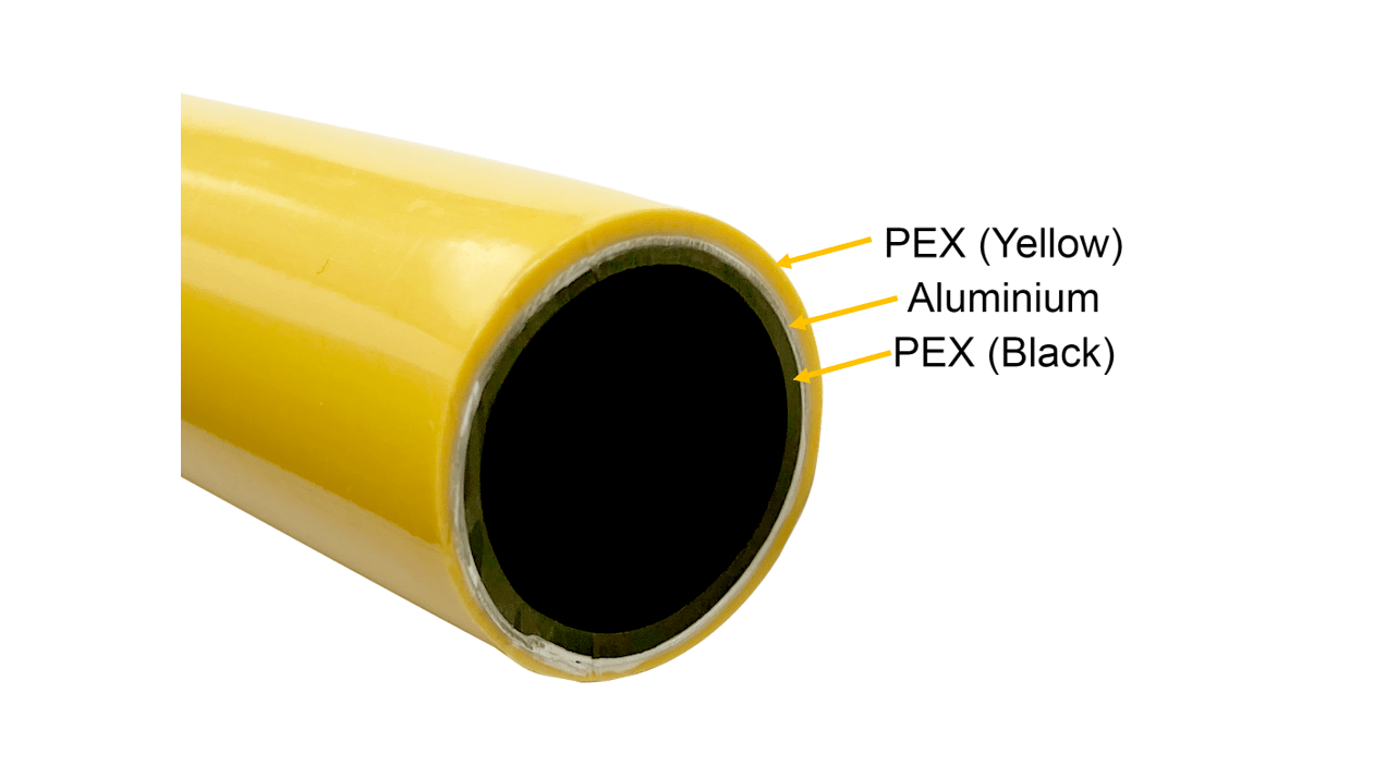 Gasline pipe consists of 3 layers: an outer yellow PE-Xb layer then aluminium and then an inner black PE-Xb layer. It complies with the Australian and New Zealand joint standards AS/NZS 4176.8 and Watermark.