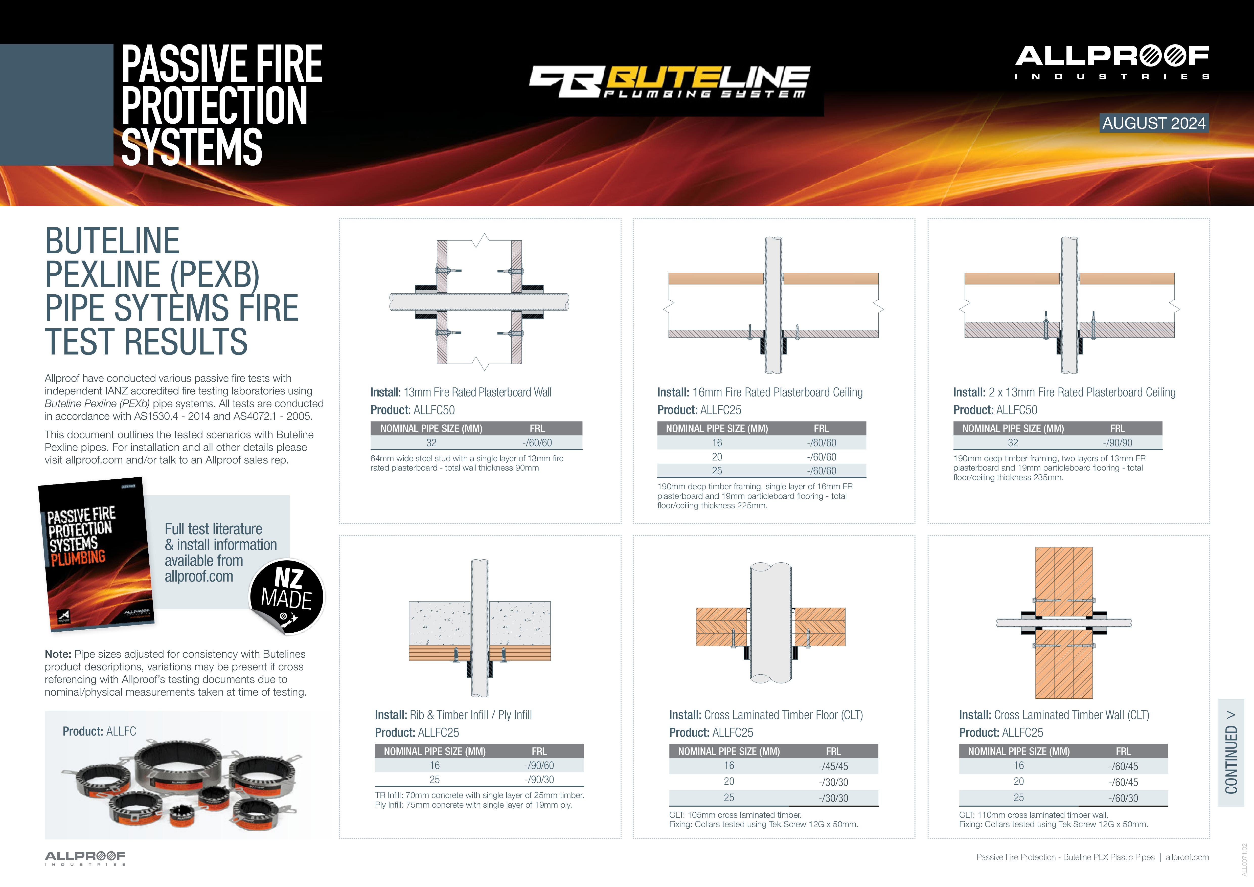 For more information on passive fire protection solutions for plumbing (such as fire collar and sealants), or for expert guidance to achieve the required rating and protection, please contact Allproof (email info@allproof.co.nz, phone 09 481 8020) or refer to their website (www.allproof.co.nz).